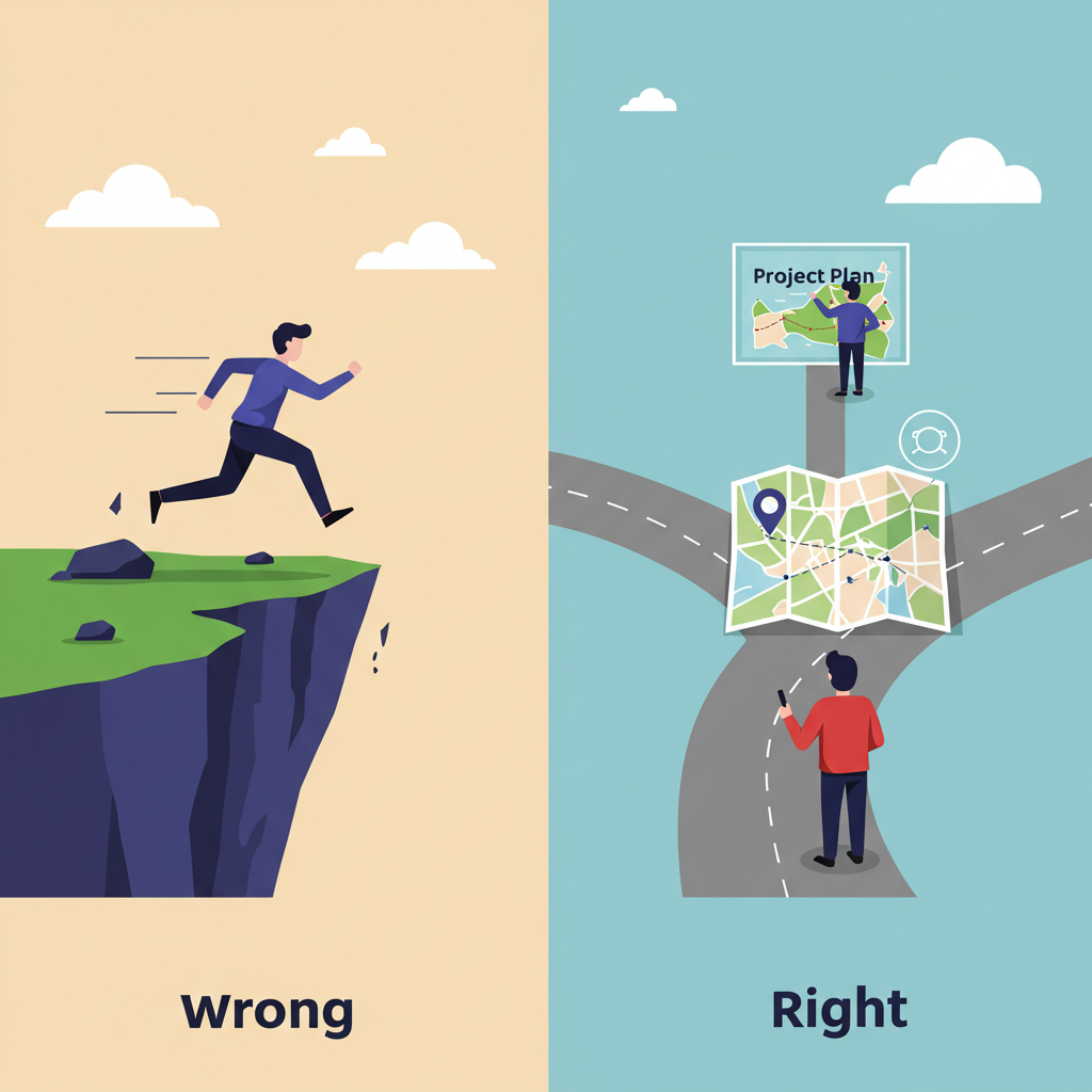 좋은 계획은 속도를 늦추는 것이 아니라, 잘못된 길로 가서 시간을 낭비하는 것을 막아 결과적으로 더 빨리 목표에 도달하게 합니다. PMBOK에서 말하는 계획은 한번 정하면 바꿀 수 없는 돌덩이가 아니라, 상황에 맞게 지속적으로 '점진적으로 구체화(Progressive Elaboration)'되는 살아있는 문서입니다. '빨리 가는 것'과 '제대로 가는 것'의 균형이 중요합니다.